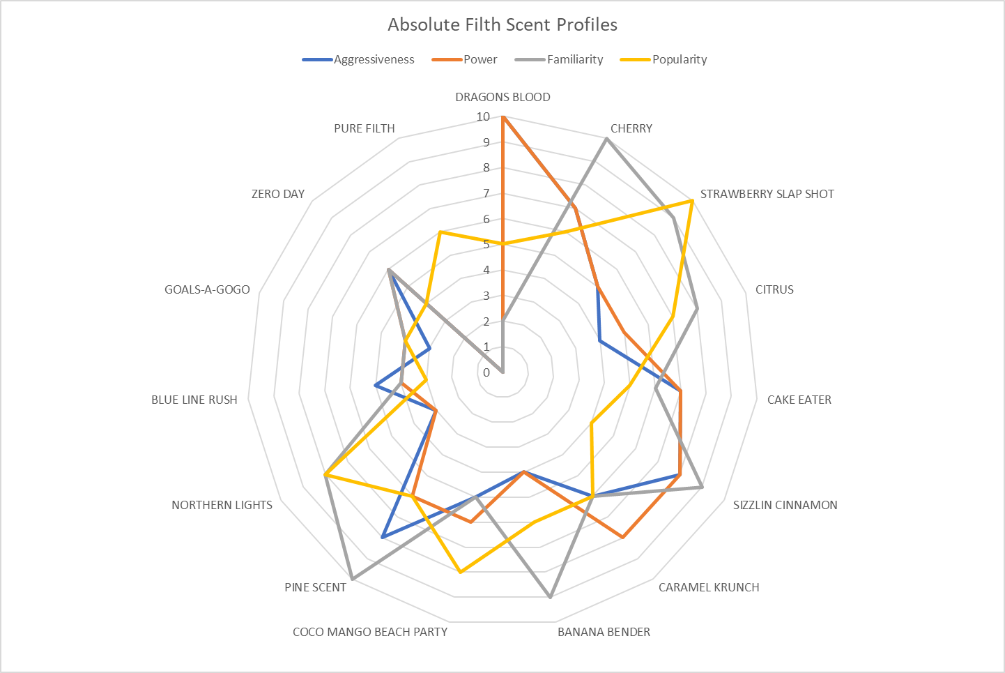 **Pure Filth does not contain scent so it does not have data in some categories.
